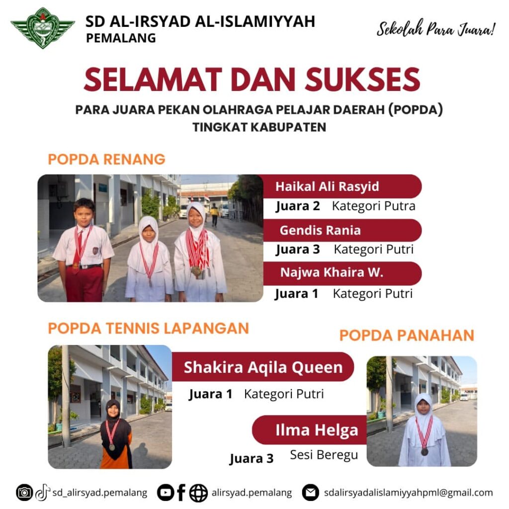 Pekan Olahraga Pelajar Daerah (POPDA) tingkat Kabupaten Pemalang kembali digelar pada tanggal 21 Agustus-3 September 2024 dengan 14 cabang olahraga yang diperlombakan. SD Al-Irsyad Al-Islamiyyah Pemalang berhasil membawa pulang 6 Piala POPDA tingkat Kecamatan dan 5 Piala POPDA tingkat Kabupaten. Serta, salah satu atlet renang SD Al-Irsyad, Najwa Khaira Wilda dengan Gaya Dada dan Gaya Punggung berhasil melaju ke POPDA tingkat Provinsi yang akan diperlombakan pada 4-7 November 2024.